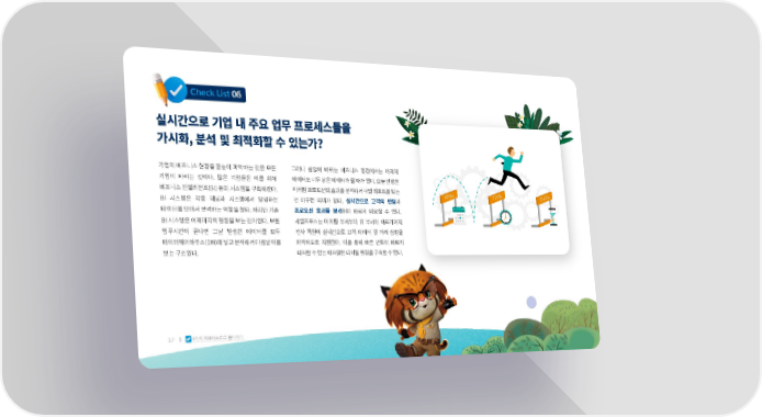 Check List 06 실시간으로�기업�내�주요�업무�프로세스들을 가시화, 분석�및�최적화할�수�있는가? 기업의 비즈니스 현황을 한눈에 파악하는 것은 모든 그러나 쉼없이 바뀌는 비즈니스 환경에서는 어제의 기업이 바라는 것이다. 많은 기업들은 이를 위해 데이터도 너무 낡은 데이터가 될 때가 있다. 오늘 진행한 비즈니스 인텔리전트(BI) 등의 시스템을 구축해왔다. 마케팅 프로모션의 효과를 분석해서 내일 리포트를 보는 BI 시스템은 각종 채널과 시스템에서 발생하는 건 아무런 의미가 없다. 실시간으로 고객의 반응과 데이터를 모아서 분석하는 역할을 했다. 하지만 기존 프로모션 효과를 분석해야 빠르게 대응할 수 있다. BI 시스템은 어제까지의 현황을 보는 것이었다. 보통 세일즈포스는 마케팅 부서부터 IT 부서에 이르기까지 업무시간이 끝나면 그날 발생한 데이터를 모두 전사 직원이 실시간으로 고객 데이터 및 거래 상황을 데이터웨어하우스(DW)에 넣고 분석해서 다음날 이를 파악하도록 지원한다. 이를 통해 빠른 변화에 빠르게 보는 구조였다. 대처할 수 있는 애자일한 디지털 환경을 구축할 수 있다. 17 �가지 체크리스트로 돌아가기
