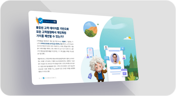 Check List 05 통합된�고객�데이터를�기반으로 모든�고객접점에서�개인화된 가치를�제안할�수�있는가? 고객경험을 극대화하기 위해 필수적인 요소는 개인화다. 개인화는 각 고객에 최적화한 경험을 실시간으로 제공하는 것을 말한다. 고객은 채널과 시간에 관계없이 자신의 니즈와 기호에 맞는 서비스 경험을 원한다. 예를 들어 해외여행을 계획하고 있는 이에게 어느날 누군가 자신이 가고 싶은 곳의 여행상품 할인쿠폰을 제공한다면, 그가 이 상품을 구매할 가능성은 높아질 것이다. 이를 위해서는 고객의 이력과 행동 데이터를 통합적으로 수집하고 분석해야 한다. 하지만 모든 데이터 수집에는 늘 어려움이 따른다. 애플이나 구글과 같은 기업들은 써드파티의 쿠키 사용을 제한하고 있어, 마케팅 담당자들은 더 다양한 데이터를 활용해야 한다. 고객의 거래 데이터나 공개 관심사와 선호도뿐 아니라 이메일 주소, 소셜ID와 같은 공개된 디지털 프로필에 의존도가 커지고 있다. 15 �가지 체크리스트로 돌아가기