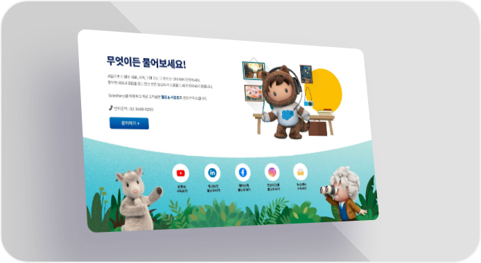 무엇이든 물어보세요! 세일즈포스 팀에 제품, 가격, 구현 또는 그 외 모든 것에 대해 문의하세요. 풍부한 지식과 경험을 갖고 있는 전문 담당자가 도움을 드리기 위해 대기 중입니다. Salesforce를 이용하고 계신 고객님은 헬프 & 서포트로 문의 부탁드립니다. 전화문의 : 02-3498-6200 문의하기 유튜브 링크드인 페이스북 인스타그램 뉴스레터 구독하기 팔로우하기 팔로우하기 팔로우하기 구독하기