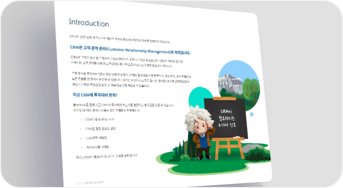Introduction CRM은 15년 넘게 비즈니스와 세일즈 부문을 떠들썩하게 만든 단순한 유행어가 아닙니다. CRM은 고객 관계 관리(Customer Relationship Management)의 약자입니다. CRM은 고객의 정보 및 고객과의 소통을 관리하기 위한 시스템을 일컫습니다. CRM의 목적은 장기간 지속되는 고객 관계를 수립해 고객 로열티를 기반으로 비즈니스 성장을 도모하는 것입니다. 고객 정보를 관리하는 CRM 앱을 통해 연락 정보, 이메일 및 SNS를 통한 팔로우업, 작업 관리, 성과 트래킹 등 모든 정보를 한 곳에서 확인할 수 있습니다. 숨겨진 비법이라고 것은 없지만, 올바른 CRM을 실행함으로써 세일즈 자체와 효율성을 높이고, 예측 정확도를 개선할 수 있습니다. 지금 CRM에 투자해야 할까? 본 eBook을 통해 지금 CRM에 투자해야 하는지를 결정하는 데 도움을 받을 수 있습니다. 이어질 네 개의 장에서 다음과 같은 주제를 다루게 됩니다. CRM이 • CRM이 필요하다는 신호 필요하다는 • CRM을 통한 생산성 향상 6가지 신호 • CRM전략 개발법 • 투자수익률 극대화 우선, CRM이 필요하다는 6가지 신호를 살펴봅시다. 3 완벽 정리 CRM 핸드북