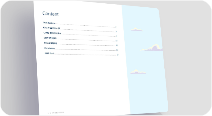 Content Introduction............................................................................................................................................ 3 CRM이 필요하다는 신호................................................................................................................................ 4 CRM을 통한 생산성 향상................................................................................................................................ 6 CRM 전략 개발법........................................................................................................................................ 10 투자수익률 극대화........................................................................................................................................ 12 Conclusion............................................................................................................................................. 14 유용한 리소스.............................................................................................................................................. 15 2 완벽 정리 CRM 핸드북