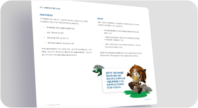 2장 - CRM을 통한 생산성 향상 세일즈 파이프라인 판매 시간 작은 기업체의 세일즈 팀은 신규 고객을 지속 유입시키는 작업에 시간을 내기 힘들 세일즈 직원들은 판매에 집중할 시간이 필요합니다. 해결하기 어려운 시간적 제약도 수도 있습니다. 이러한 문제는 아래와 같은 원인으로 발생합니다. 분명 있지만, 쉽게 해결할 수 있는 것도 있습니다. • 리드를 적절한 세일즈 직원에게 연결하지 못함 • 반복 작업을 자동화함으로써 세일즈 직원들이 거래를 성사시키는 데에 • 잠재 고객에 대한 정보 부족 집중할 수 있음 •• 구성원들이 정보를 공유하고 소통할 수 있는 단일 채널을 만들어 끝없는 • 통화 전 잠재 고객에 대한 지식 부족 이메일 및 통화 고리를 끊어낼 수 있음 • 미래 파이프라인에 대한 가시성 및 예측 부족 • 모바일로 전환하면 세일즈 직원이 이동 중일 때 문제가 되는 다운타임을 하지만 CRM을 활용하면 세일즈 직원들이 잠재 고객에 대한 데이터를 저장할 수 있기 없애고 커뮤니케이션을 할 수 있음 때문에 고객 구매 프로세스의 모든 단계에서 필요한 정보를 준비해 놓을 수 있습니다. 올바른 CRM 시스템은 클라우드를 통해 언제 어디서든 모바일 디바이스와 연동되기 또한, 가시성 및 예측과 관련된 지표도 빠르게 제공됩니다. 때문에 팀 전체가 터치 몇 번으로 가장 최신의 정보를 제공받을 수 있습니다. 클라우드 기반 CRM 툴을 활용하면 세일즈 팀이 잠재 고객 및 고객과의 모든 소통을 트래킹할 수 있고, 언제 어디서든 데이터에 접근할 수 있습니다. 7 완벽 정리 CRM 핸드북 salesforce.com