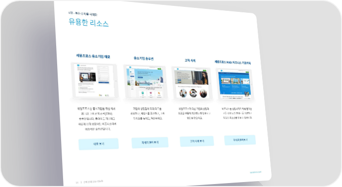4장 - 투자수익률 극대화 유용한 리소스 세일즈포스 중소기업 데모 중소기업 솔루션 고객 사례 세일즈포스 Hub: 비즈니스 기초지식 세일즈포스는 중소기업을 위한 세계 기업이 성장함에 따라 리드를 세일즈포스가 다른 기업의 성장과 비즈니스를 성장시키기 위해 필요한 최고의 고객 관계 관리(CRM) 생성하고, 세일즈를 증진하고, 고객 성공을 어떻게 지원했는지 알아보고 모든 것이 담긴 가이드 등 다양하고 솔루션입니다. 클라우드 기반이고 만족도를 높이고, 혁신하세요. 영감을 얻으세요. 유용한 리소스를 찾을 수 있습니다. 사용이 쉬워 성장하는 비즈니스에게 이상적인 솔루션입니다. 데모 보기 자세히 알아보기 고객 사례 보기 자세히 알아보기 15 완벽 정리 CRM 핸드북 salesforce.com
