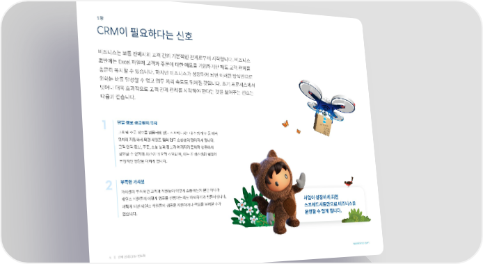 1장 CRM이 필요하다는 신호 비즈니스는 보통 판매자와 고객 간의 기본적인 관계로부터 시작합니다. 비즈니스 초반에는 Excel 파일에 고객과 주문에 대한 메모를 기입하기만 해도 고객 관계를 충분히 유지할 수 있습니다. 하지만 비즈니스가 성장하게 되면 이러한 방식만으로 원하는 바를 달성할 수 없고 업무 처리 속도도 뒤처질 것입니다. 초기 프로세스에서 벗어나 더욱 효과적으로 고객 관계 관리를 시작해야 한다는 것을 보여주는 신호는 다음과 같습니다. 1 단일 정보 공급원의 부재 고객 및 주문 정보를 컴퓨터에 있는 스프레드시트나 수기 메모 등 여러 위치에 저장하게 되면 세일즈 팀의 업무 효율성이 떨어지게 됩니다. 고객 연락 정보, 주문, 소통 등의 정보가 여기저기 흩어져 한곳에서 확인할 수 없기에 시간이 더 오래 소요되며, 이는 곧 생산성과 협업에 부정적인 영향을 미치게 됩니다. 2 부족한 가시성 가시성이 부족하면 고객과 직원들이 어떻게 소통하는지 뿐만 아니라 세일즈 직원들이 어떻게 업무를 진행하는지도 파악하기가 힘들어집니다. 사업이 성장하게 되면 이렇게 되면 세일즈 직원들의 성공을 지원하거나 책임을 부여할 수가 스프레드시트만으로 비즈니스를 없습니다. 운영할 수 없게 됩니다. 4 완벽 정리 CRM 핸드북 salesforce.com