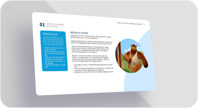 하이테크 기업의 스마트한 의사 결정을 이끄는 데이터의 위력 | 6 데이터 기반 의사 결정을 통한 01 보다 지능적인 운영 경영진 체크리스트: 세일즈포스의 지원 방법 세일즈포스는 리더와 직원 및 고객을 모두 지원하는 스마트한 대화형 시각적 분석을 통해 지금 업계는 빠른 맥락화와 의사 결정 데이터와 분석을 의사 결정 프로세스에 손쉽게 통합합니다. 인텔리전스로 운영 성과를 개선할 수 있는 Tableau를 이용하면 더욱 빠르고 직관적이며 간단하게 데이터를 탐색하고 관리할 수 있게 데이터 기반 의사 결정 모델로 전환 중입 해주는 고급 분석 플랫폼을 통해 문제를 보다 지능적인 방식으로 쉽게 해결할 수 있습니다. 니다. 이러한 전 세계적 변화에 발맞춰 기업이 해야 할 일은 다음과 같습니다. 사용자는 인사이트를 쉽게 발견 및 공유하여 의사 결정자들을 지원하고 대응성을 • 경영진에서부터 하위 조직까지 데이터가 개선할 수 있습니다. 세일즈포스는 적절한 데이터를 적시기에 제공함으로써 실행 사용되는 방식을 재고 가능한 인사이트가 조직 전체에 통합되어 유연하게 이동할 수 있도록 지원하고 • 복잡하고 다양한 데이터 세트를 모든 모두가 동일한 데이터에 접근할 수 있도록 지원합니다. 비즈니스 부문의 의사 결정 프로세스에 세일즈포스는 실시간에 가까운 시각화와 AI 기반의 데이터 분석, 실행 가능한 통합 • 신뢰할 수 있고 미래 지향적인 데이터와 인텔리전스 보고서를 통해 위험을 그 어느 때보다 빠르게 식별하고 비효율성을 • 분석에 대한 손쉬운 액세스를 보장 최소화하며 해결 과제와 기회에 더욱 빠르고 정확하게 대응합니다. 세일즈포스는 명확성을 높일 수 있는 주요 툴과 기능 다음과 같은 방식을 통해 데이터를 전략적 이점으로 전환합니다. • 및 기술을 식별 • 고객의 새로운 요구와 비즈니스 모델 확장에 맞춰 운영을 확장할 때 일어나는 마찰을 단일창에 모든 것을 통합하여 가시성을 최소화 증진 • 시장의 기대치를 충족하기 위해 제품 영역 또는 획득을 통해 성장 가능한 영역을 식별 • 가치를 더하는 새로운 제안, 제품 및 혁신적 서비스 개발을 지원 • 비용을 절감하는 동시에 고객 생애 가치를 지속적으로 확보 및 보유할 수 있도록 지원